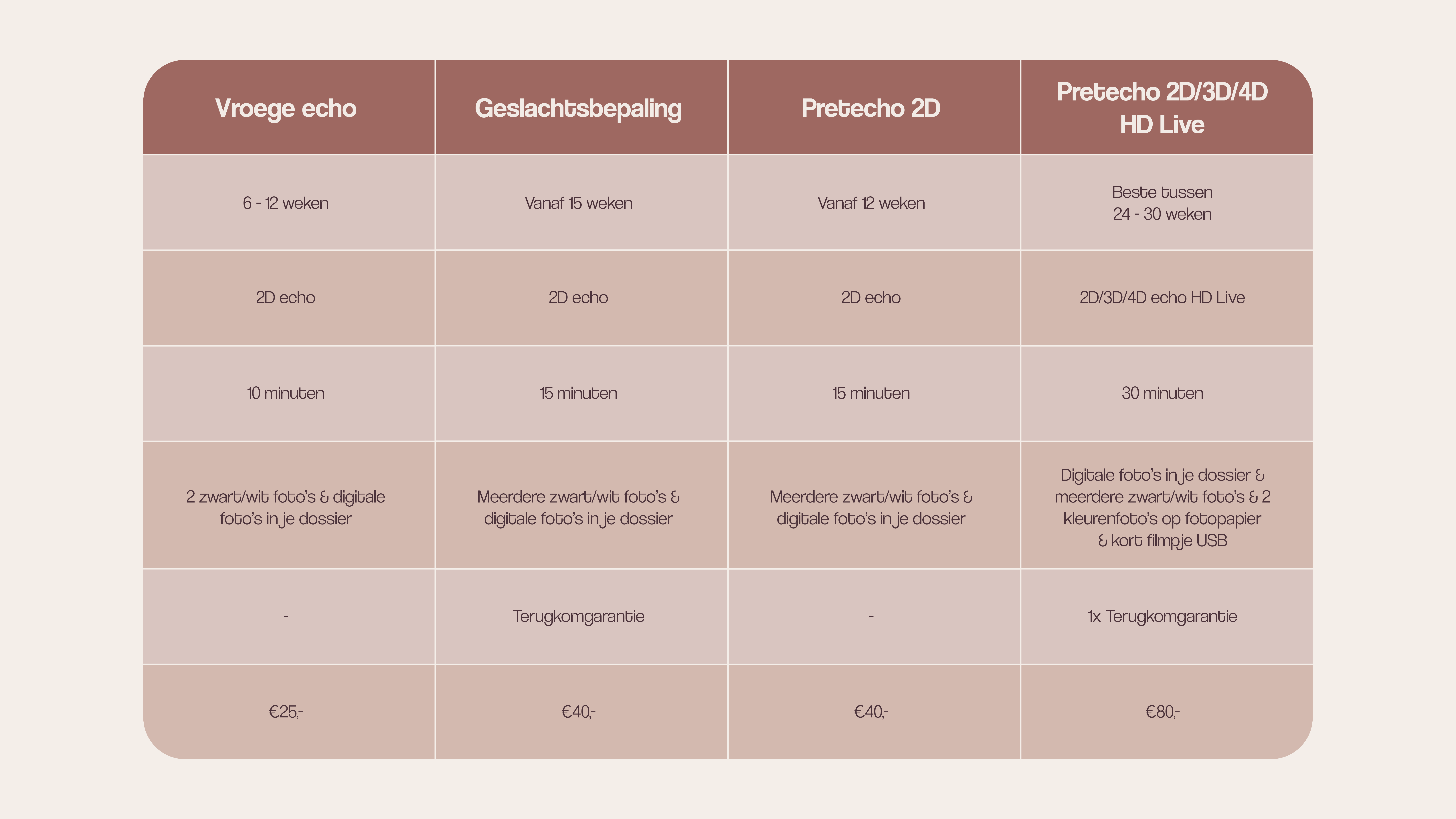 We maken deze echo’s met veel plezier. Uiteraard zijn familie/vrienden welkom bij de echo, dit bepaal je helemaal zelf! Ben je ervan bewust dat er ook bij een pretecho onverwachte bijzonderheden gezien kunnen worden. In dat geval zullen we je hier altijd van op de hoogte stellen.